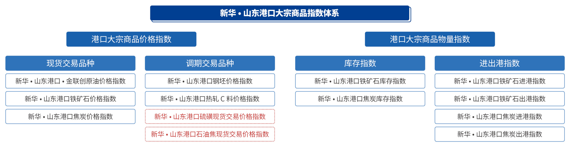 新華·山東港口大宗商品指數由中國經濟信息社聯合山東省港口集團共同發布,2021年首次發布後不斷升級完善,形成了價格指數、庫存指數和進出港指數綜合體係。2023年指數再度擴容,新增硫磺現貨交易價格指數和石油焦現貨交易價格指數的發布。此次擴容後,指數體係包括原油、鐵礦石、焦炭、鋼坯、熱軋C料、硫磺現貨交易和石油焦現貨交易七隻價格指數,以及鐵礦石庫存、焦炭庫存、鐵礦石進港、鐵礦石出港、焦炭進港、焦炭出港六隻物量指數。