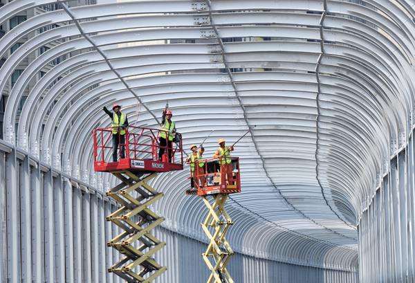 8月10日,中國一冶的工人在高溫下進行聲屏障防火塗料塗刷施工(如圖)。據中國一冶姑嫂樹匝道項目負責人介紹,工程正在進行最後的聲屏障、亮化以及幫寬段路麵修複等施工,地麵也在同步進行施工,項目進入最後衝刺施工階段,預計8月底建成通車。該項目是軍運會保障線路一號線路配套工程,主要施工任務包括三環線幫寬、右轉上橋匝道和姑嫂樹路主線幫寬以及地麵局部改造。 (記者 陳明 通訊員 李曉靜 攝)