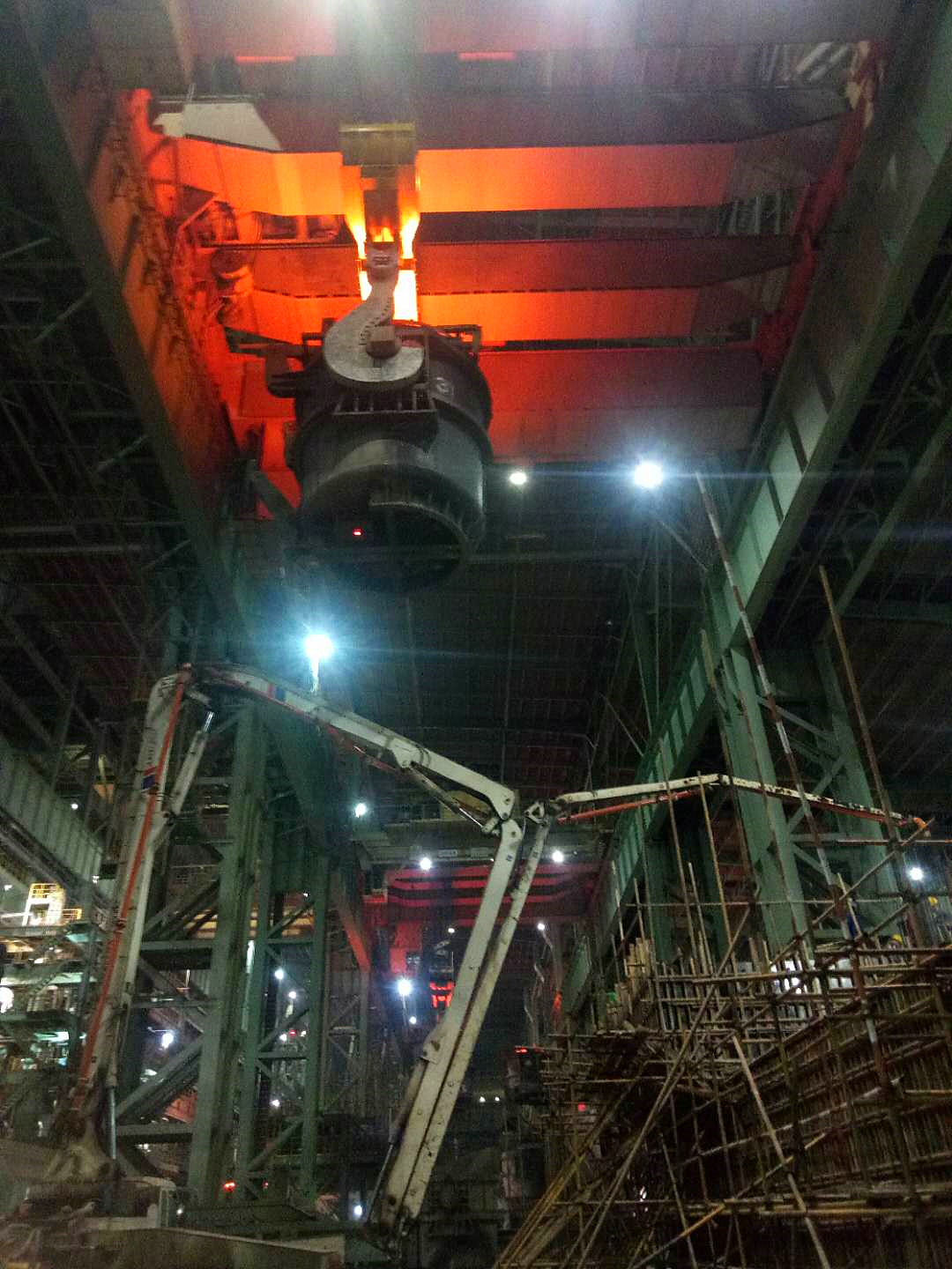 寶鋼湛江連鑄項目是在原廠房2#4#連鑄機之間新增3#1650mm板坯連鑄機及配套的公輔設施,主要包括新增3#連鑄機、增建A-C軸線3~5柱出坯跨廠房、新增1套中間罐傾翻及廢料台車裝置、新增兩套燃氣球罐及配套管線、新增3#連鑄機濁環水處理係統以及D列輥道改造、手清場搬遷等施工內容,屬在線技改項目。此次澆築的大包回轉台位於原廠房F-G列13-14軸zhou線xian間jian,周zhou圍wei環huan境jing複fu雜za,施shi工gong時shi吊diao運yun鋼gang水shui的de行xing車che來lai回hui運yun行xing,作zuo業ye人ren員yuan需xu及ji時shi避bi讓rang,混hun凝ning土tu澆jiao築zhu時shi,泵beng車che站zhan位wei困kun難nan且qie與yu煉lian鋼gang區qu域yu生sheng產chan深shen度du交jiao叉cha,需xu要yao項xiang目mu部bu精jing心xin規gui劃hua並bing及ji時shi與yu業ye主zhu溝gou通tong,以yi確que保bao混hun凝ning土tu的de連lian續xu澆jiao築zhu。