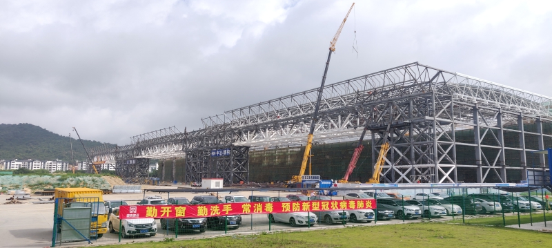 該項目於2月20日開工,是疫情期間珠海市第一個複工複產的在建項目。由於構件眾多、機場附近區域限高導致大型機械吊裝受限、跨度大且需分級累積提升等諸多困難,又受疫情不利影響,工期非常緊張。項目複工後大力組織人員機械進場,進行24小時施工作業趕工,項目部全體成員兩個多月以來齊心協力、攻堅克難,成功追回因疫情影響耽誤的工期,最終圓滿完成了既定的工期目標。此舉深受各方好評,有效保障了屋麵、幕牆、室內裝修等專業的施工進場,為整個展館如期竣工,確保航展按時順利舉行打下了堅實的基礎。