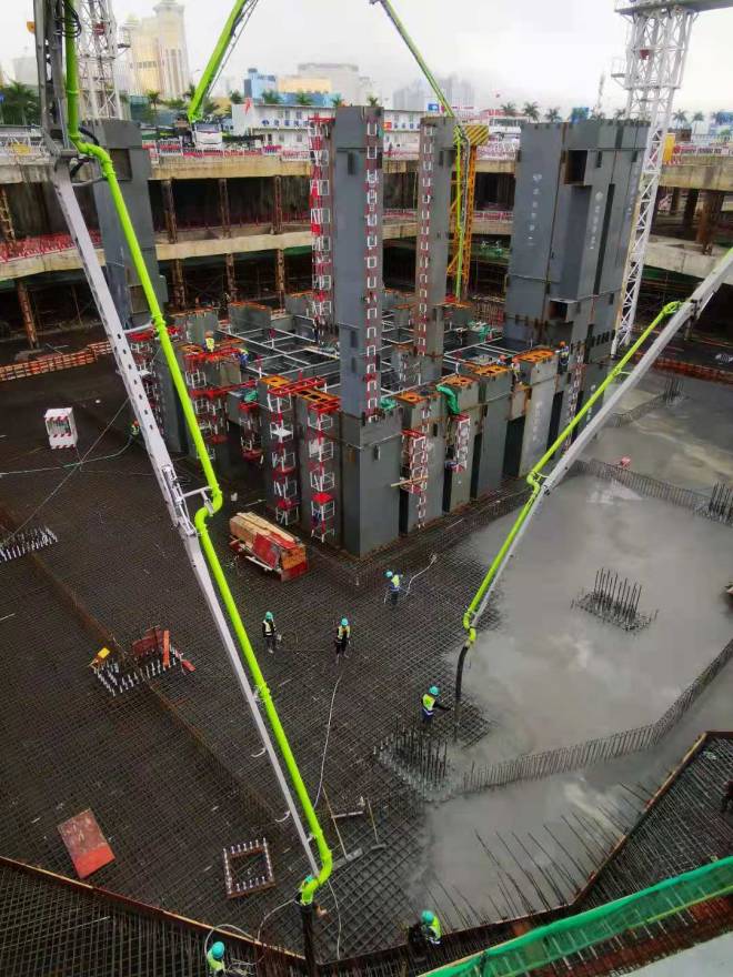 在全員的共同努力下,施工現場可謂是一天一個樣三天大變樣。單就T2塔樓一個區域而言,五月三日至六日淩晨,60小時完成混凝土澆築6200餘方,至此T2塔ta樓lou基ji礎chu全quan部bu施shi工gong完wan成cheng,進jin入ru主zhu體ti結jie構gou施shi工gong階jie段duan。澆jiao築zhu過guo程cheng中zhong,由you於yu需xu要yao三san台tai汽qi車che泵beng同tong時shi作zuo業ye,加jia之zhi假jia期qi期qi間jian道dao路lu限xian行xing,為wei了le確que保bao混hun凝ning土tu供gong應ying,值zhi班ban管guan理li人ren員yuan多duo次ci前qian往wang混hun凝ning土tu供gong應ying公gong司si,駐zhu場chang協xie調tiao混hun凝ning土tu供gong應ying事shi宜yi。由you於yu棧zhan橋qiao場chang地di小xiao,加jia之zhi來lai回hui過guo往wang車che輛liang過guo多duo,稍shao有you安an排pai不bu合he理li就jiu會hui造zao堵du車che現xian象xiang,現xian場chang管guan理li人ren員yuan沒mei有you退tui縮suo,指zhi揮hui車che輛liang,協xie調tiao各ge個ge施shi工gong隊dui之zhi間jian的de設she備bei使shi用yong。確que保bao每mei個ge隊dui伍wu順shun利li作zuo業ye,整zheng個ge場chang地di道dao路lu通tong暢chang。