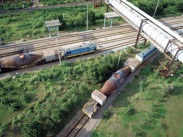 圖為鐵水罐車正忙碌穿梭在作業區。