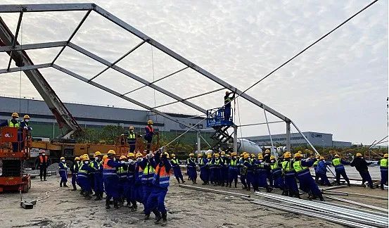 16日早上7時7分,現場作業人員調整為5個班組,在四台垂直登高車的協同流水作業下,B區第一榀屋架順利安裝就位。8時35分,B—13病患帳篷鋼結構全部安裝完畢。9時至12時經過3個小時的奮戰,B—13病患帳篷的篷布全部鋪設完畢,標誌著方艙建設的第一頂帳篷在不到12小時內全部安裝完畢。不僅詮釋了“冶金建設國家隊”的鐵軍速度,也展示了中國二十冶建設者頑強不屈的精神和責任擔當。目前現場的後續帳篷安裝作業仍在緊張進行中。