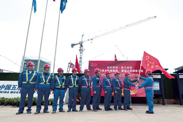 圖為中國五冶武鋼燒結項目部黨員先鋒隊授旗。
