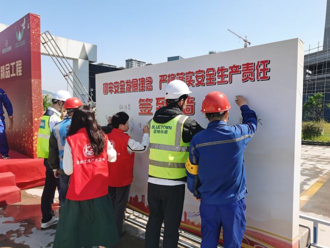 活動伊始,在富陽片區黨支部委員、銀(yin)湖(hu)安(an)置(zhi)房(fang)項(xiang)目(mu)經(jing)理(li)尹(yin)繼(ji)鵬(peng)的(de)帶(dai)領(ling)下(xia),全(quan)體(ti)黨(dang)員(yuan)麵(mian)對(dui)黨(dang)旗(qi),高(gao)舉(ju)右(you)手(shou),重(zhong)溫(wen)了(le)入(ru)黨(dang)誓(shi)詞(ci),更(geng)加(jia)堅(jian)定(ding)了(le)建(jian)設(she)平(ping)安(an)工(gong)地(di)的(de)信(xin)心(xin)和(he)決(jue)心(xin)。隨(sui)後(hou),尹(yin)繼(ji)鵬(peng)講(jiang)授(shou)了(le)“廉築平安工地 打造精品工程”主題黨課,教育引導黨員幹部堅守廉潔自律底線,築牢拒腐思想防線,為項目建設注入“廉”動(dong)力(li)。尹(yin)繼(ji)鵬(peng)號(hao)召(zhao)全(quan)體(ti)黨(dang)員(yuan)幹(gan)部(bu)進(jin)一(yi)步(bu)發(fa)揮(hui)模(mo)範(fan)帶(dai)頭(tou)作(zuo)用(yong),增(zeng)強(qiang)安(an)全(quan)管(guan)控(kong)意(yi)識(shi),樹(shu)牢(lao)安(an)全(quan)發(fa)展(zhan)理(li)念(nian),落(luo)實(shi)安(an)全(quan)生(sheng)產(chan)責(ze)任(ren),推(tui)動(dong)形(xing)成(cheng)人(ren)人(ren)關(guan)注(zhu)安(an)全(quan)、重視安全、參與安全的良好氛圍,為項目建設營造安全穩定環境。最後,黨建共建聯盟各成員單位黨員代表帶頭在“樹牢安全發展理念,嚴格落實安全生產責任”的承諾牆上簽名,並作出鄭重承諾,攜手打造平安工地。