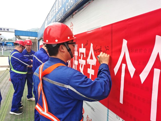 隨後,項目部管理人員與建設單位、代建單位、監理單位、協力單位管理人員在安全生產月宣傳橫幅上簽名並做出鄭重承諾。