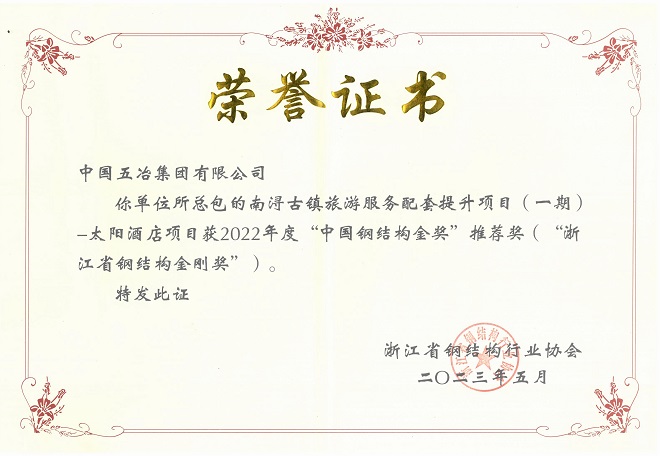 近日,中國五冶集團承建的湖州太陽酒店項目榮獲“浙江省鋼結構金剛獎”,並被推薦申報鋼結構國家級獎項——“中國鋼結構金獎”。