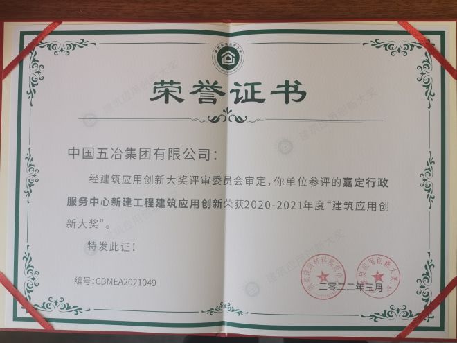 近日,國家建築材料展貿中心召開2020~2021“建築應用創新大獎”成果交流暨表彰大會,中國五冶嘉定行政服務中心新建工程榮獲“建築應用創新大獎”。