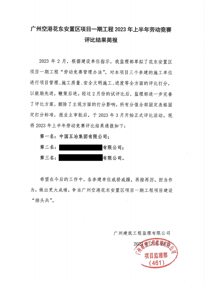 近日,中國五冶集團在廣州空港花東安置區項目一期工程2023年上半年勞動競賽評比活動中榮獲第一名。