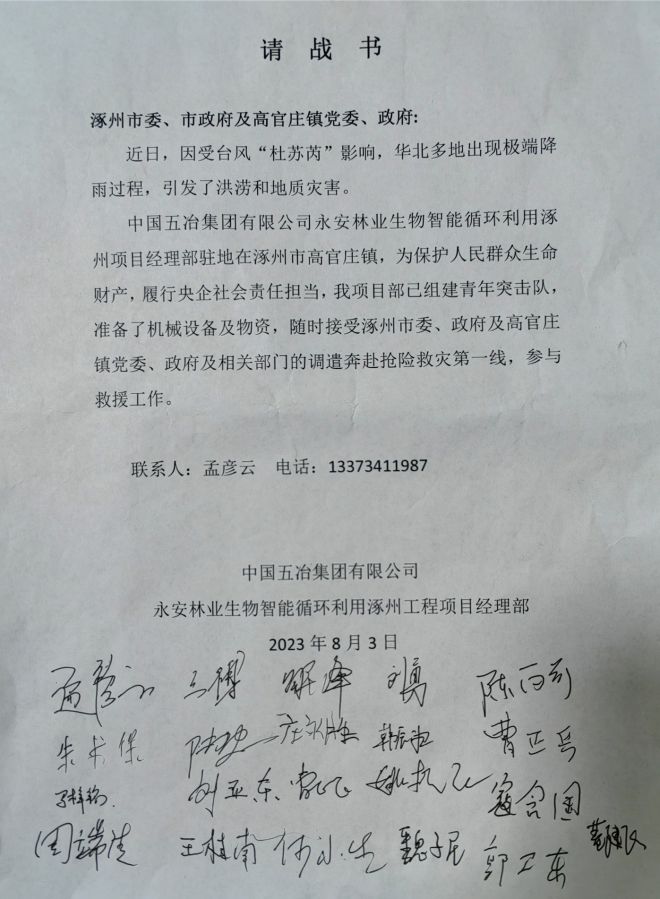 在防汛形勢嚴峻的涿州市,五冶永安林業項目部充分調動自身資源,籌集礦泉水、方便麵、麵包、餅幹等生活物資共計120xiang,juanzengdaozhuozhougaoguanzhuangzhenzhengfu,weizhoubianxiangzhenshouzaibaixingsongshangwennuan。weiqieshibaohurenminqunzhongshengmingcaichan,xiangmutuanduixunsuzujianleqingniantujidui,beihaogeleijixiewuzi,jihezuoyerenyuangongtongqianshule“請戰書”遞交屬地黨委、政府,時刻準備奔赴搶險救災第一線。