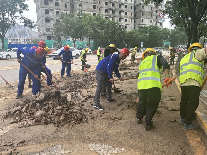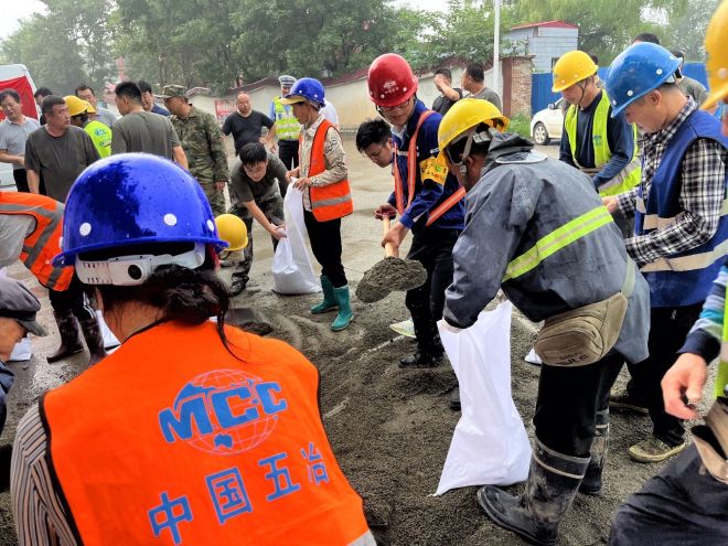 位於北京暴雨重災區門頭溝的中國五冶項目團隊在得知永定河河水超過警戒線、越過河道進入居民小區這一消息後,項目部立即出動挖掘機、籌措沙袋、組織人員全速協助永定鎮政府進行封堵、清淤等工作。針對永定鎮市政道路因極端天氣導致雨水、淤泥堆積影響市民正常出行這一情況,項目團隊快速組織鏟車、挖掘機和50餘名作業人員參與道路清理,全力保障周邊居民正常出行。