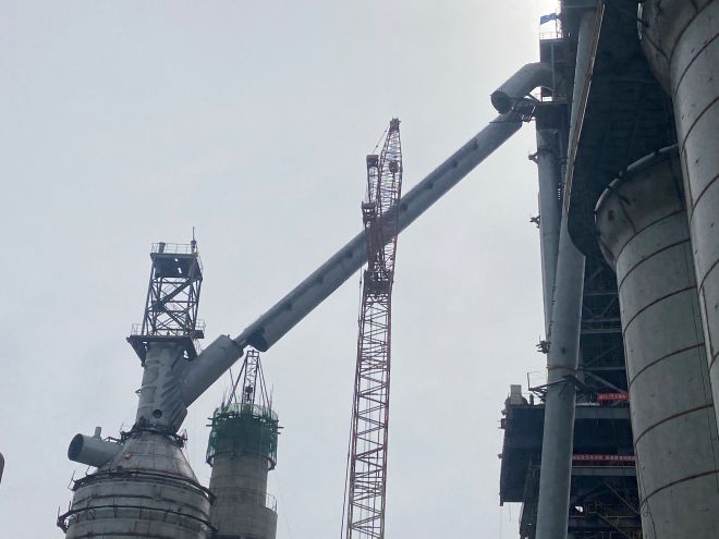 該項目位於甘肅省嘉峪關市酒鋼集團宏興鋼鐵股份有限公司廠區內,擬新建一座2070立方米高爐本體。自2023年4月1日高爐爐殼首吊起,項目部始終堅持提前謀劃、精心組織,克服了當地氣候惡劣、工期緊張等不利因素,為鋼結構封頂工作奠定了堅實基礎。此次吊裝的最後一段鋼結構為高爐下降管,整體長為48.23米,重達86噸,采用400噸履帶吊進行作業。為確保吊裝安全、順利完成,項目部根據實際情況製定了詳細周密的施工方案,加強安全技術交底,合理調配人員、機械。吊裝當天,隨著項目負責人一聲令下,最後一鉤順利起鉤,隨後鋼結構精準安裝到位,高爐主體結構順利封頂,較計劃節點提前17天完成。