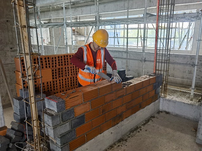 施工現場,來自專業分包隊伍的5支砌築小組爭分奪秒,亮絕活、比技能,挑磚、測量、切割、抹灰、砌築……動作嫻熟而不失節奏,在規定時間內完成牆麵砌築。最終經過現場評委從多個方麵綜合打分,評選出前三名及優秀獎獲得隊伍。