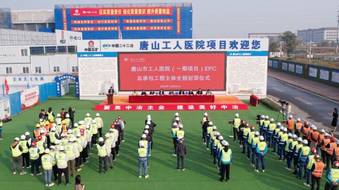 10月27日,中國二十二冶承建的唐山工人醫院一期項目全部主樓主體結構封頂。