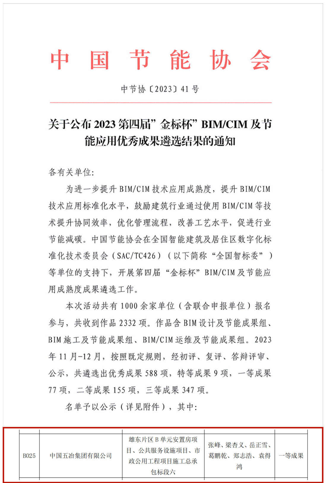 12月29日,中國五冶集團雄東B單元安置房施工總承包標段六項目榮獲2023第四屆“金標杯”BIM/CIM及節能應用一等成果。