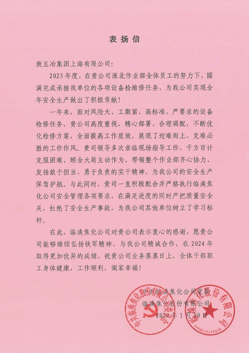 中國五冶集團淮北作業部收到臨渙焦化股份有限公司表揚信