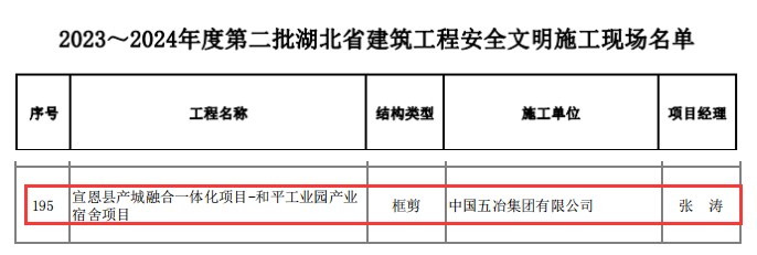 立足新起點,奮近“開門紅”。日前,中國五冶集團湖北省兩個項目喜獲佳獎。其中,黃石新港港產城融合發展綜合配套項目海口湖科創島及周邊基礎配套設施-企業研發中心(東區A座)和科創孵化中心、企業服務中心均榮獲2022-2023年度第四批“湖北省建築結構優質工程”;宣恩縣產城融合一體化項目-和平工業園產業宿舍項目榮獲2023-2024年度第二批“湖北省建築工程安全文明施工現場”,3號樓榮獲2022-2023年度第四批“湖北省建築結構優質工程”。