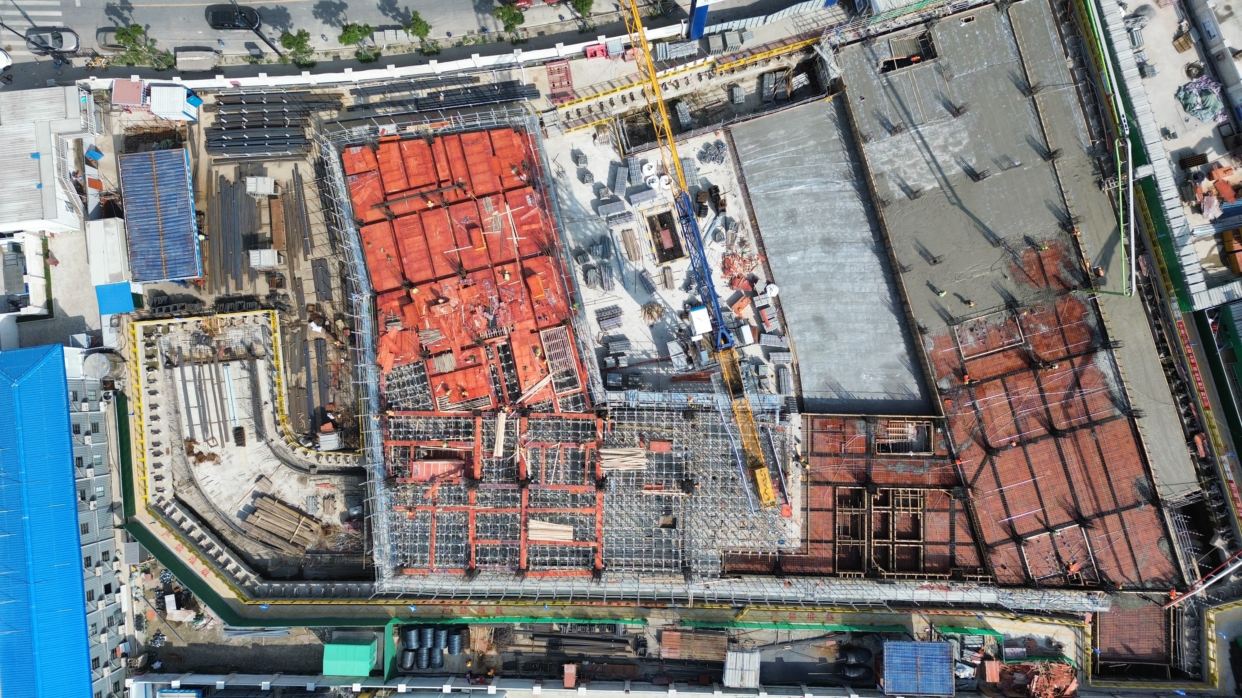 由於該項目地處103社區施工密集區域,場地狹窄、材cai料liao堆dui放fang及ji周zhou轉zhuan困kun難nan,項xiang目mu部bu在zai施shi工gong前qian嚴yan格ge按an照zhao策ce劃hua開kai展zhan交jiao底di,優you化hua作zuo業ye分fen區qu和he平ping麵mian布bu置zhi,明ming確que過guo程cheng技ji術shu和he質zhi量liang控kong製zhi要yao點dian,最zui大da限xian度du降jiang低di場chang地di限xian製zhi等deng因yin素su對dui工gong期qi的de影ying響xiang,確que保bao了le地di下xia室shi頂ding板ban作zuo業ye順shun利li推tui進jin;同時,項目部對混凝土澆築順序、模板支撐體係的加固及混凝土振搗作業等進行全程監督,嚴格把控每一個環節,確保工程質量。
