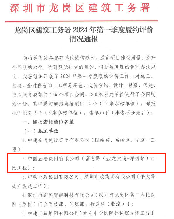 近日,深圳市龍崗區建築工務署發布2024年第一季度履約評價情況通報,中國五冶集團及其承建的富惠路(鹽龍大道-坪西路)市政工程項目在556個項目合同、240家參建單位中脫穎而出,在通報表揚的14個項目(15家參建單位)榜上有名。