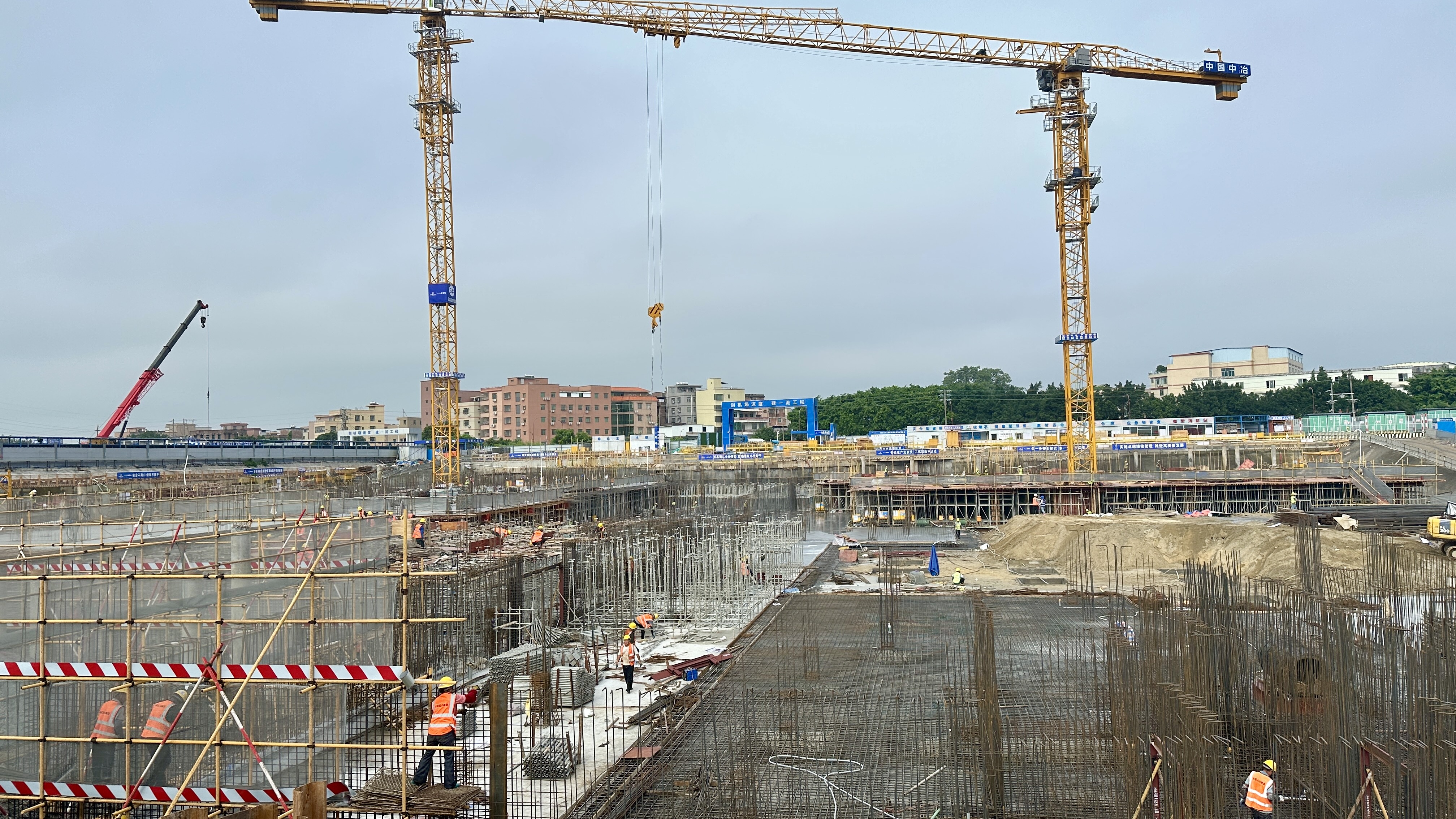 本次澆築的最後一塊基礎底板為麵積1800平方米的不規則底板,最大厚度達1.3米,混凝土澆築總量約1300立方米,澆築方量大,質量標準高。由於該項目施工場地受限,隻能采用1台天泵進行施工作業,項目團隊通過精細編製施工方案、heliguihuajiaozhushishishunxu,kexuezuzhishanghuncheyongyibeisandefangshi,kaizumalishigong,tongshitiqianyubeicailiaojinchang,helipeizhirenyuancuofenglungang,buduanqianghuaxiangmudongtaiguankong,youxiaoyingduileguangdongmanchangyuji、台風等不利天氣影響,最終用時近31小時,順利完成項目最後一塊基礎底板澆築,為後續全力開展地下室結構施工奠定了堅實基礎。