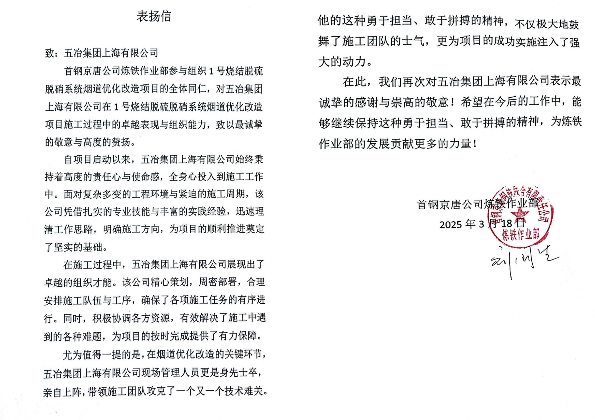 近jin日ri,中zhong國guo五wu冶ye集ji團tuan工gong程cheng技ji術shu服fu務wu公gong司si首shou鋼gang京jing唐tang作zuo業ye部bu收shou到dao業ye主zhu單dan位wei首shou鋼gang京jing唐tang公gong司si煉lian鐵tie作zuo業ye部bu表biao揚yang信xin一yi封feng,高gao度du讚zan揚yang首shou鋼gang京jing唐tang作zuo業ye部bu在zai業ye主zhu單dan位wei1號燒結脫硫脫硝係統煙道優化改造項目施工過程中的卓越表現與組織能力。