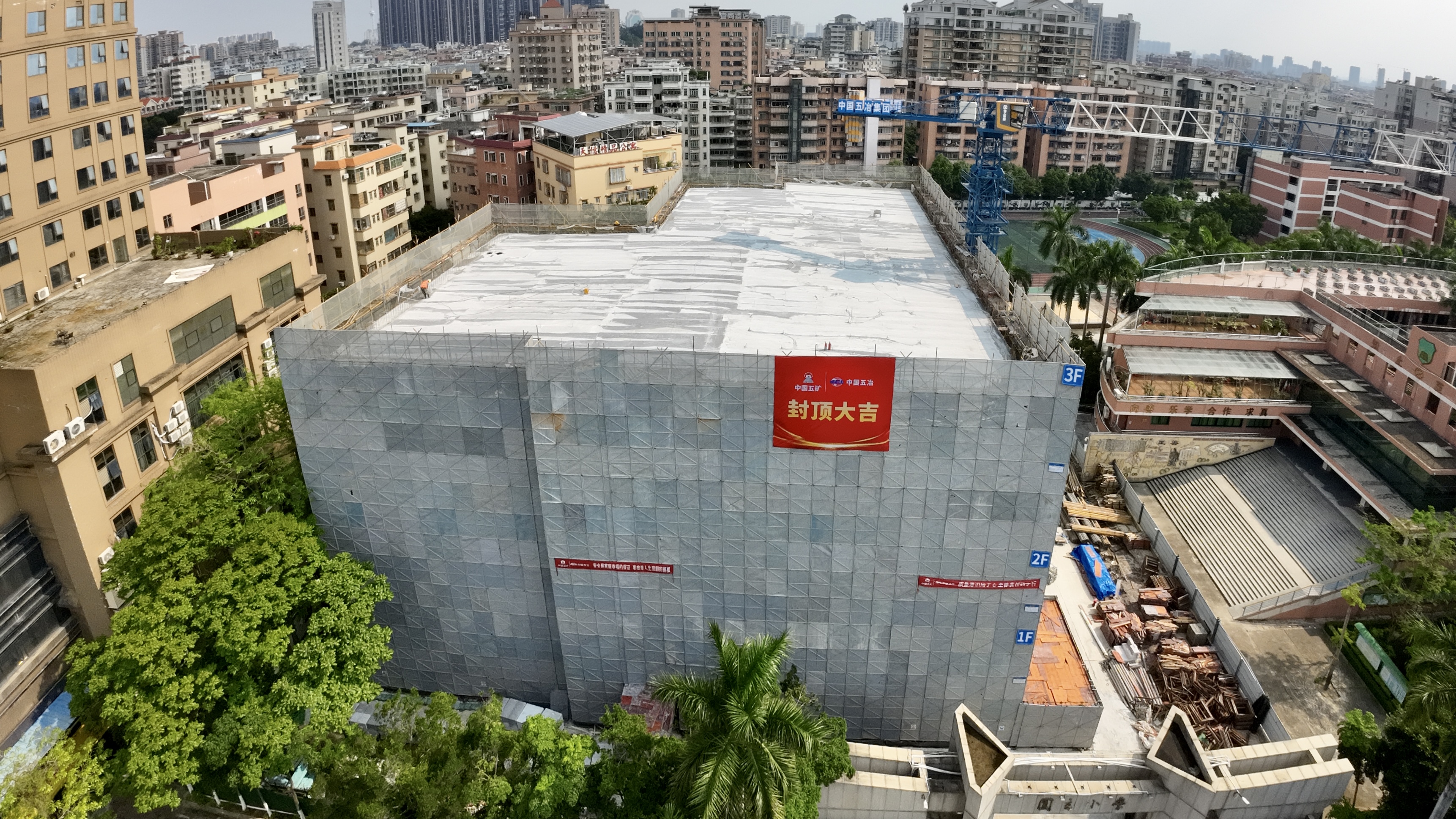 該項目位於花都區迎賓大道繁忙的交通樞紐,在建設過程中,麵對場地狹小、材料進出困難、砂層地質地下水含水量高、校內施工噪音汙染大等多重挑戰,項目團隊按照“黨建+”引領,將黨建工作融入履約、安全、質量等重點環節,圍繞項目重大工期節點優化施工計劃、創新施工工藝、采取先進的降噪等措施,並積極加強與周邊居委會、城管、交警大隊等多方的溝通協調,及時解決項目推進過程中的重難點問題,有力推動項目順利實現主體結構全麵封頂目標。