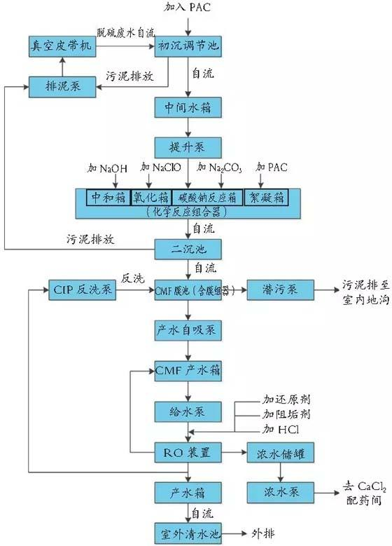 工業汙水處理係統主要包括初沉池、調節池、化學反應池、微濾池、膜處理係統幾大處理單元。初沉調節池主要的作用是調節進水水量和水質。通過初沉池池可以去除汙水中的大部分懸浮物,同時還能夠去除少部分的高價離子沉澱,另外,在間斷生產廢水的情況下,初沉池和調節池還可以起到調節汙水水量的作用,為汙水處理係統中設備運行的連續性和穩定性創建有利條件。經過初沉調節池之後的廢水進入到後續的氧化反應池中進行處理。氧化反應池中又包含有多個處理單元,如中和反應裝置、氧化反應裝置、絮凝反應裝置等。廢水經過氧化反應吃後取出大部分的有機物和還原性物質,然後進入到後續的二沉池進行沉澱分離,取出前段反應過程中產生的沉澱物。從二沉池出來的上清液進入到的過濾膜係統中進行深度處理,通過微孔濾膜可以去除進水中的大部分懸浮物和膠體雜質,廢水進一步淨化,經過微孔濾膜處理後的出水可以滿足後續反滲透處理裝置的進水要求,SDI值低於5,SS值低於5mg/L,濁度低於1NTU。在進入到反滲透係統處理之前,對進水的酸堿度進行調節,使其穩定在6.5~7之間,同時添加阻垢劑來防治水垢產生,加入亞硫酸氫鈉避免反滲透係統的膜材料被氧化,延長使用壽命,然後通過水泵將水送入到反滲透係統中,經過反滲透係統處理,水中的有機物、微生物以及微細懸浮粒子會被去除,實現汙水的淨化。