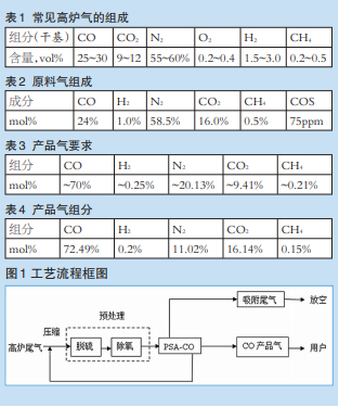 本文以投產的湖南衡鋼百達先鋒能源科技有限公司高爐煤氣變壓吸附提純CO裝置為例,介紹了采用北大先鋒變壓吸附技術分離CO的應用情況。裝置設計收率92%,CO產品氣濃度根據用戶需要在60%~70%範圍內可調,產品氣作為燃料用於鋼管加工。設計流程圖、原料氣組成及產品氣要求如圖1、表2、表3所示。