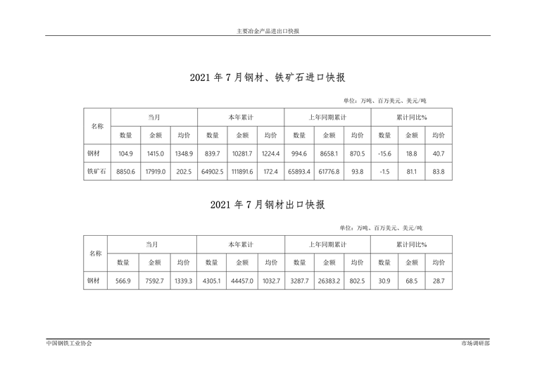 2021年7月主要冶金產品進出口快報