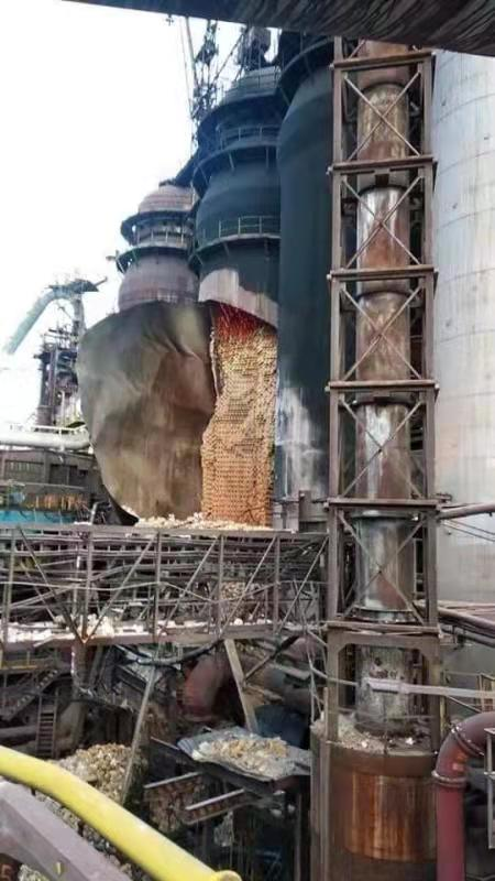圖2捷克一鋼廠2000m3高爐頂燃式熱風爐於2021年12月初發生的驚天爐體大爆炸安全事故,爐殼炸開一個麵積約100-150平方米的大洞,熱風爐蓄熱室數百噸1000多攝氏度高溫大牆磚和格子磚被炸出體外。