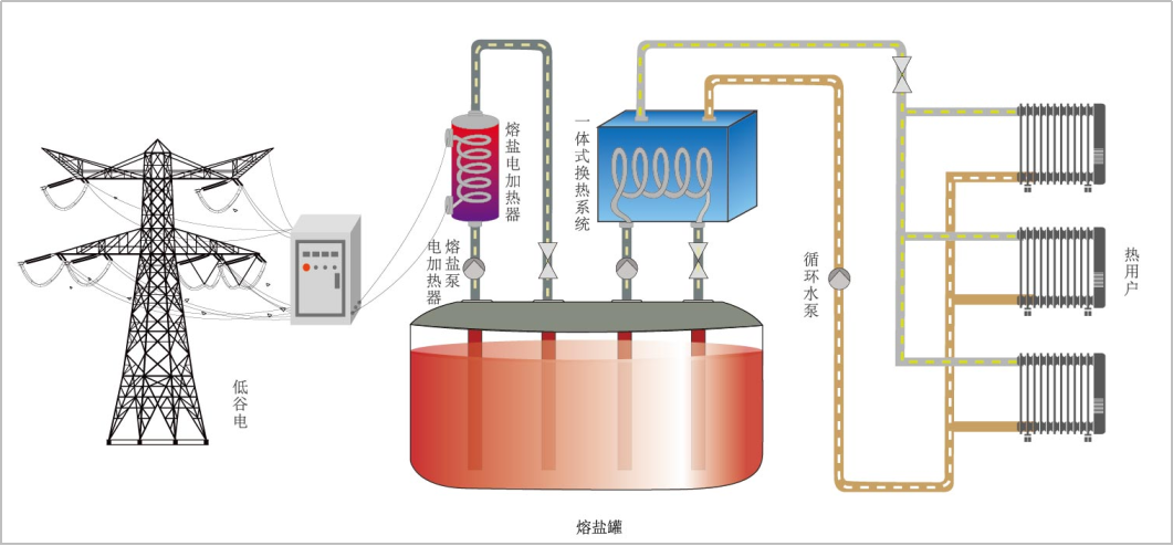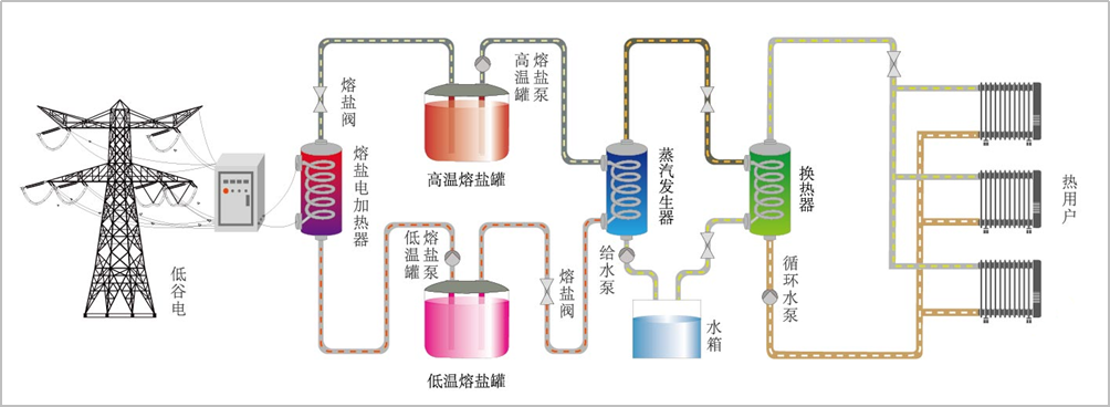 熔鹽儲熱在清潔能源供暖中應用的主要技術路線是雙罐熔鹽儲熱和單罐熔鹽儲熱兩種,雙罐儲熱供暖係統適用於大型供暖項目,單罐儲熱供暖係統適用於小型供暖項目。熔鹽儲熱供暖係統在低穀電時通過熔鹽電加熱器加熱熔鹽並進行存儲,峰電供暖時則通過換熱係統將儲存的熱能傳遞給水,實現供暖功能。