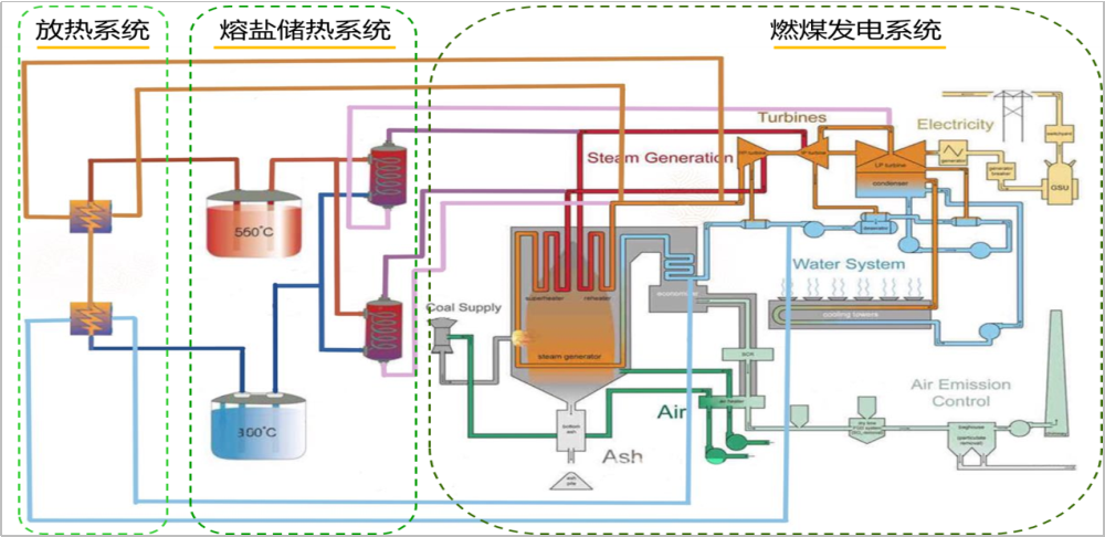 由(you)於(yu)汽(qi)機(ji)低(di)負(fu)荷(he)運(yun)行(xing)能(neng)力(li)要(yao)遠(yuan)高(gao)於(yu)鍋(guo)爐(lu),所(suo)以(yi)火(huo)電(dian)機(ji)組(zu)深(shen)度(du)調(tiao)峰(feng)在(zai)技(ji)術(shu)方(fang)麵(mian)存(cun)在(zai)的(de)困(kun)難(nan)主(zhu)要(yao)是(shi)低(di)負(fu)荷(he)工(gong)況(kuang)下(xia)鍋(guo)爐(lu)不(bu)能(neng)穩(wen)定(ding)燃(ran)燒(shao)以(yi)及(ji)脫(tuo)硝(xiao)係(xi)統(tong)不(bu)能(neng)正(zheng)常(chang)運(yun)行(xing)導(dao)致(zhi)大(da)氣(qi)汙(wu)染(ran)物(wu)排(pai)放(fang)超(chao)標(biao)的(de)問(wen)題(ti)。因(yin)此(ci)利(li)用(yong)熔(rong)鹽(yan)儲(chu)熱(re)係(xi)統(tong)將(jiang)鍋(guo)爐(lu)產(chan)生(sheng)的(de)高(gao)溫(wen)蒸(zheng)汽(qi)熱(re)量(liang)儲(chu)存(cun)起(qi)來(lai),削(xue)弱(ruo)原(yuan)本(ben)剛(gang)性(xing)聯(lian)係(xi)的(de)“爐機耦合”。存儲的熱量根據需要再返送汽輪機組發電,這樣就能在保證鍋爐安全運行的同時,靈活性調節汽輪機運行出力,實現機組的靈活運行。