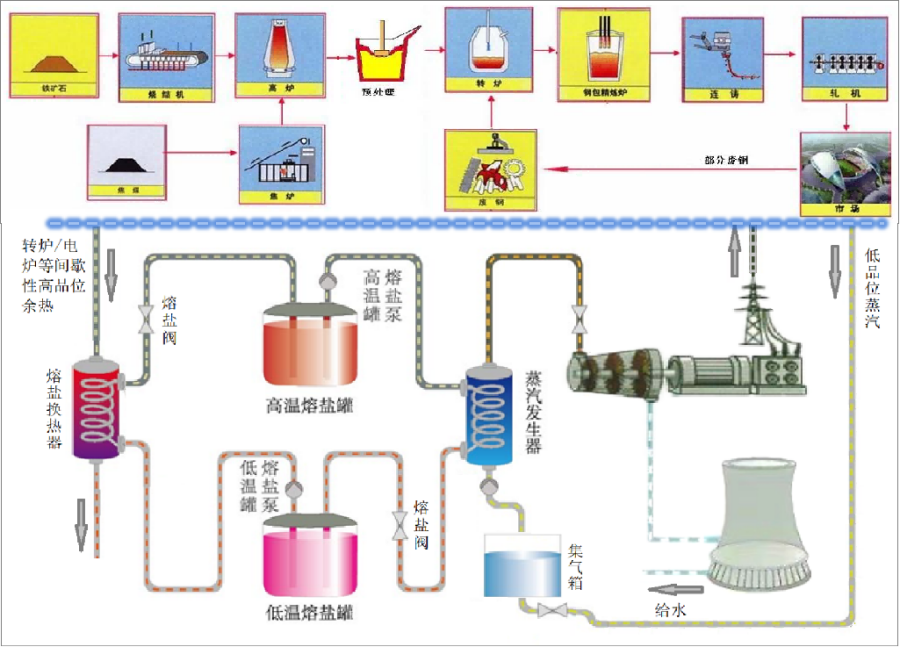 目前,冶金企業利用餘熱產生蒸汽的技術主要有:幹熄焦、燒結環冷餘熱發電、轉爐煤氣汽化冷卻、電爐煙氣餘執huishouhejiareluyanqiqihualengquedeng。raner,zhexieyurezhengqipinzhipubianjiaodi,qieshoushengchangongyiyingxiang,mouxiezhengqihaijuyoujianxiexinghezhouqixingdetedian,zhebujinxianzhilezhengqihouxuliyong,yejiangdileyurehuishouxiaoguo。rumuqianliangangdedianlu、轉(zhuan)爐(lu)等(deng)設(she)備(bei),廣(guang)泛(fan)煙(yan)道(dao)汽(qi)化(hua)餘(yu)熱(re)鍋(guo)爐(lu)來(lai)回(hui)收(shou)波(bo)動(dong)性(xing)較(jiao)大(da)的(de)間(jian)歇(xie)性(xing)高(gao)溫(wen)餘(yu)熱(re)。將(jiang)高(gao)溫(wen)熱(re)能(neng)轉(zhuan)化(hua)為(wei)低(di)品(pin)位(wei)的(de)低(di)壓(ya)飽(bao)和(he)蒸(zheng)汽(qi)進(jin)行(xing)發(fa)電(dian),導(dao)致(zhi)餘(yu)熱(re)資(zi)源(yuan)得(de)不(bu)到(dao)充(chong)分(fen)利(li)用(yong)。因(yin)此(ci),利(li)用(yong)熔(rong)鹽(yan)將間jian歇xie性xing和he周zhou期qi性xing的de高gao溫wen餘yu熱re進jin行xing回hui收shou並bing存cun儲chu,對dui冶ye金jin過guo程cheng中zhong多duo點dian的de低di品pin位wei飽bao和he蒸zheng汽qi進jin行xing過guo熱re,或huo者zhe直zhi接jie轉zhuan化hua為wei穩wen定ding可ke持chi續xu的de高gao溫wen蒸zheng汽qi,使shi發fa電dian功gong率lv和he能neng源yuan利li用yong效xiao率lv得de到dao大da幅fu提ti升sheng,改gai善shan餘yu熱re發fa電dian係xi統tong的de經jing濟ji性xing,同tong時shi提ti高gao餘yu熱re發fa電dian係xi統tong的de靈ling活huo性xing,顯xian著zhu提ti高gao經jing濟ji效xiao益yi。