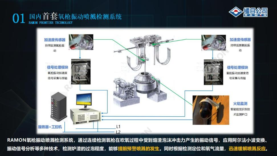 首先是智能煉鋼平台,鐳目公司開發了一整套完整的智慧煉鋼係統,包含了主廢料管控係統、智能廢鋼判級係統、一鍵脫硫(智能扒渣等)、轉爐智能煉鋼(自動出鋼等)、智能LF精煉、煉鋼生產準時化係統,以及國內首套氧槍振動噴濺檢測係統。