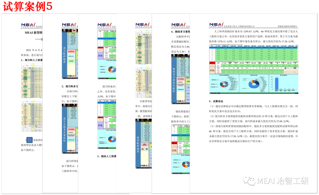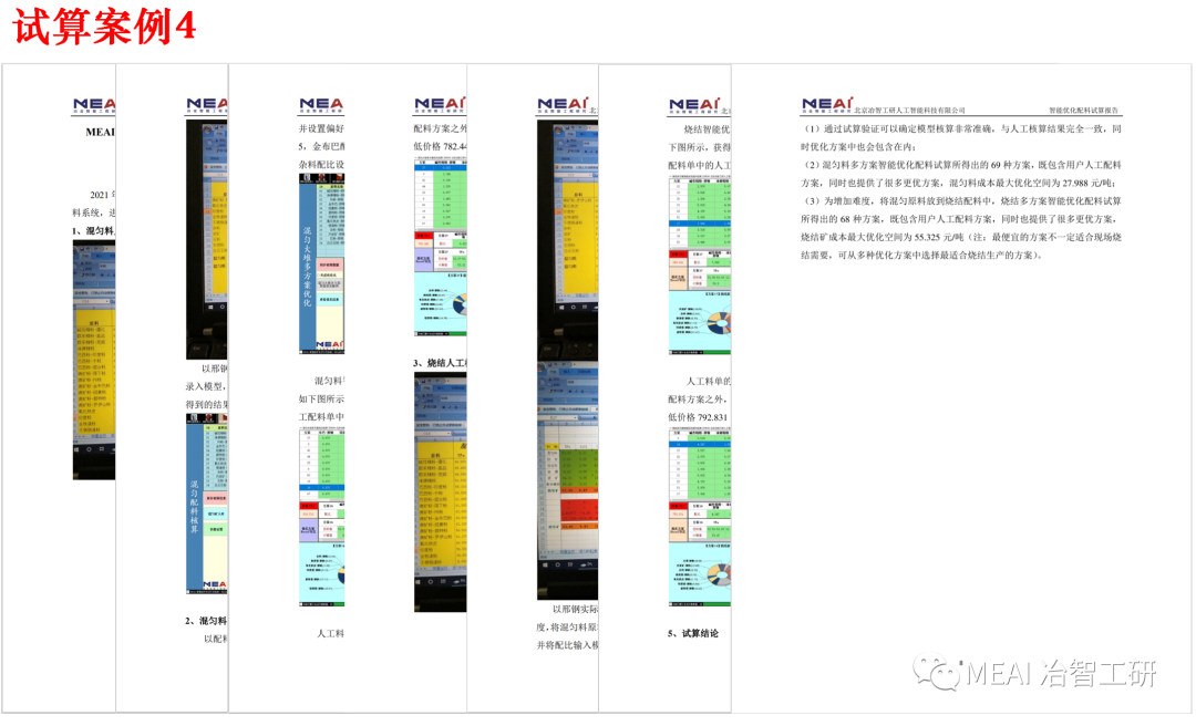 該係統已在多家鋼鐵企業進行了應用試算(部分試算案例如下圖所示),應(ying)用(yong)試(shi)算(suan)采(cai)用(yong)現(xian)場(chang)人(ren)工(gong)配(pei)料(liao)單(dan)對(dui)應(ying)的(de)原(yuan)燃(ran)料(liao)數(shu)據(ju),錄(lu)入(ru)係(xi)統(tong)後(hou)按(an)照(zhao)相(xiang)同(tong)的(de)目(mu)標(biao)要(yao)求(qiu)進(jin)行(xing)優(you)化(hua)配(pei)料(liao),確(que)定(ding)符(fu)合(he)當(dang)前(qian)生(sheng)產(chan)狀(zhuang)況(kuang)可(ke)執(zhi)行(xing)的(de)方(fang)案(an),並(bing)與(yu)人(ren)工(gong)配(pei)料(liao)成(cheng)本(ben)進(jin)行(xing)比(bi)較(jiao),確(que)定(ding)成(cheng)本(ben)優(you)化(hua)空(kong)間(jian),實(shi)際(ji)應(ying)用(yong)情(qing)況(kuang)總(zong)結(jie)如(ru)下(xia):