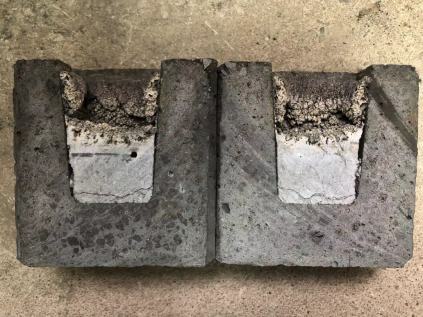 圖3 兩種澆注材料浸泡於鐵水內試驗結果