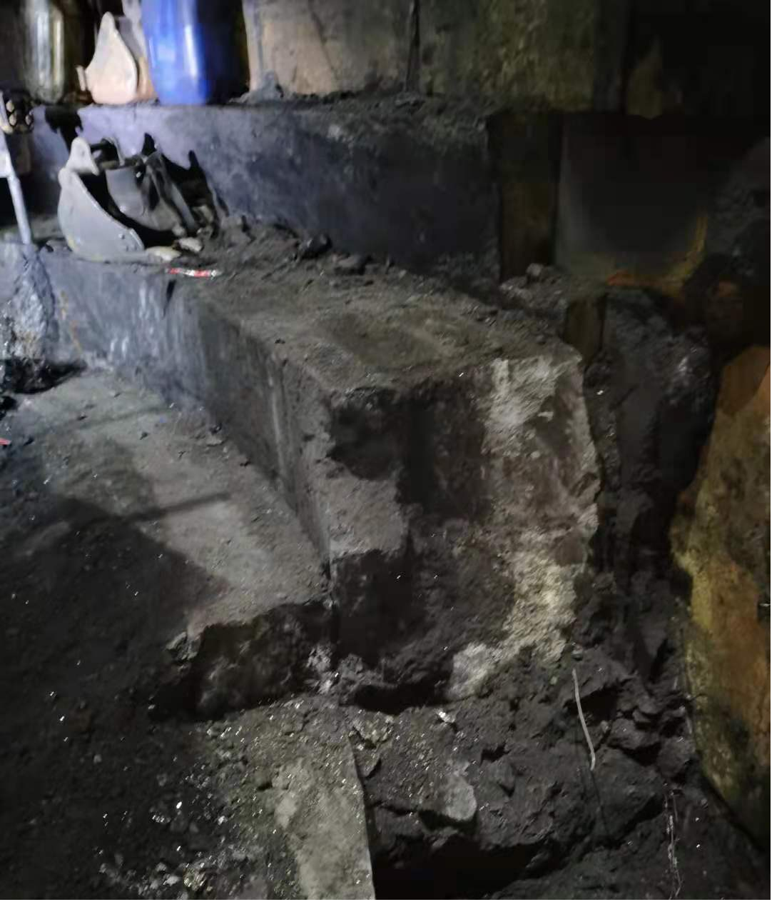 國內某鋼鐵公司1260m³高爐,2018年停爐大修,采用碳磚保護性拆除,爐缸整體澆注(未澆注爐底陶瓷墊)的快速修複方式,方案如圖8所示,爐缸采用薄壁內襯。由於側壁碳磚侵蝕嚴重,相較於前期砌築設計尺寸,爐缸直徑擴大1000mm,爐缸容積擴大55m³,側壁澆築厚度320mm,象腳區斜段加厚,爐底陶瓷墊保存完好,未澆注。運行至2021年4月產能置換停爐大修,爐缸清理後,材料侵蝕情況對比下右圖所示。澆注體殘存情況為: