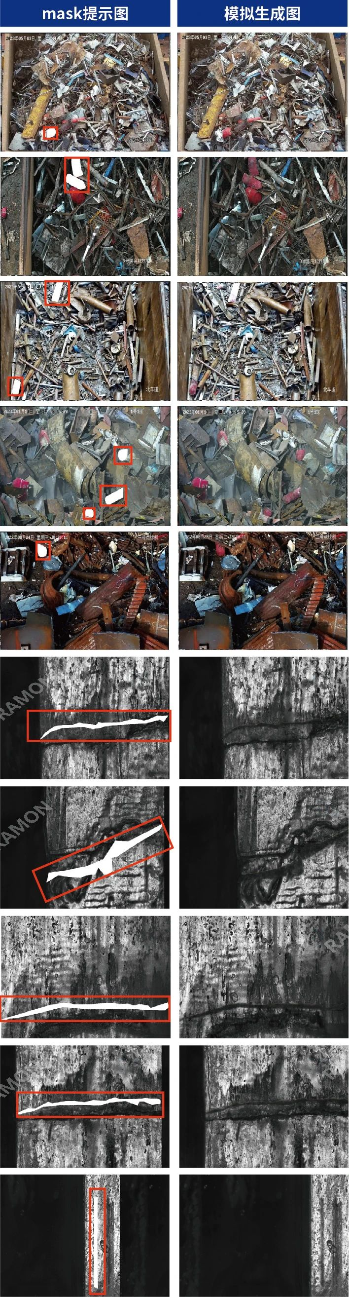 近日,鐳目智眸團隊在鋼鐵視覺領域取得重大突破,成功將AIGC技術應用於提升稀缺樣本異常場景檢測水平,該技術顯著提升了鑄坯缺陷,廢鋼內危險物及拒收件等稀缺數據的采集速度,從而突破了異常情況數據集稀少的瓶頸,極大地提升了異常場景的識別和檢測能力!