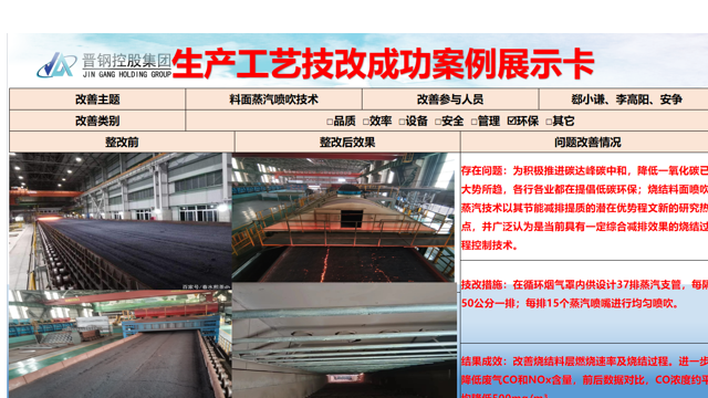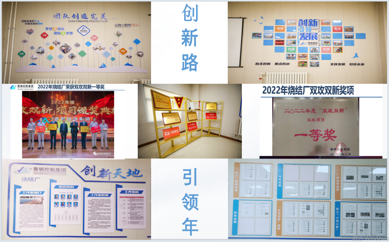 燒結廠創新工作室成立以來,先後開展實施了30項技改創新項目,有效解決了生產技術、設備和管理問題;出台下發了《工藝檢查管理製度》《設備聯鎖管理規定》《安全責任包片製》和《主管績效評價辦法》等26項製度、標準及方案。從安全、環保、生產、設備等全方位完善燒結廠管理製度和方向;推進智能製造提升16項,包括自動打水係統、台車輪自動檢測和環冷機溫度自動檢測等。針對目前長期製約燒結生產的重點、難點問題組織工作室人員召開技術攻關會議,先後解決了燃料破碎、白灰消化、自動打水等8項廠級技術攻關,實施了料麵噴吹蒸汽、技改轉爐煤氣點火、預熱塊礦烘幹係統等技術改造;以燒結煙氣一氧化碳排放作為重點攻關項目,有力地配合完成了《晉城市生態環境局關於對山西晉鋼智造科技實業有限公司實施一氧化碳排放總量控製的通知》要求,為公司爭取到優惠的環保政策,實現了燒結工藝綠色低碳。