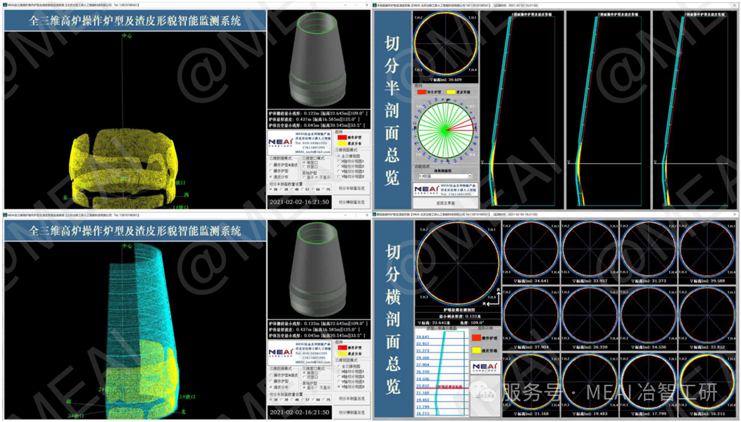 全三維還原整個高爐爐腹、爐腰、爐身的操作爐型及渣皮形貌分布,實現全三維操作爐型的精確還原與動態模擬,實現全三維渣皮形貌分布和厚度的跟蹤,以直觀的三維圖像、數據、趨勢曲線等形式在線監測操作爐型變化、渣皮形貌分布等,無盲區360度全方位三維展現爐體操作爐型、爐牆結厚、渣皮形貌分布狀況,實時跟蹤操作爐型變化、爐牆結厚、渣皮形成與脫落過程,可360度任意角度切分、及不同高爐橫剖麵任意切分展示,為操作人員及時發現潛在風險並采取預防措施提供強有力的依據。