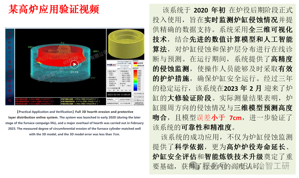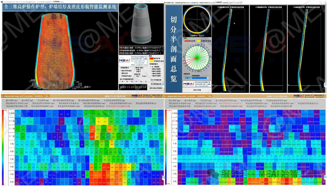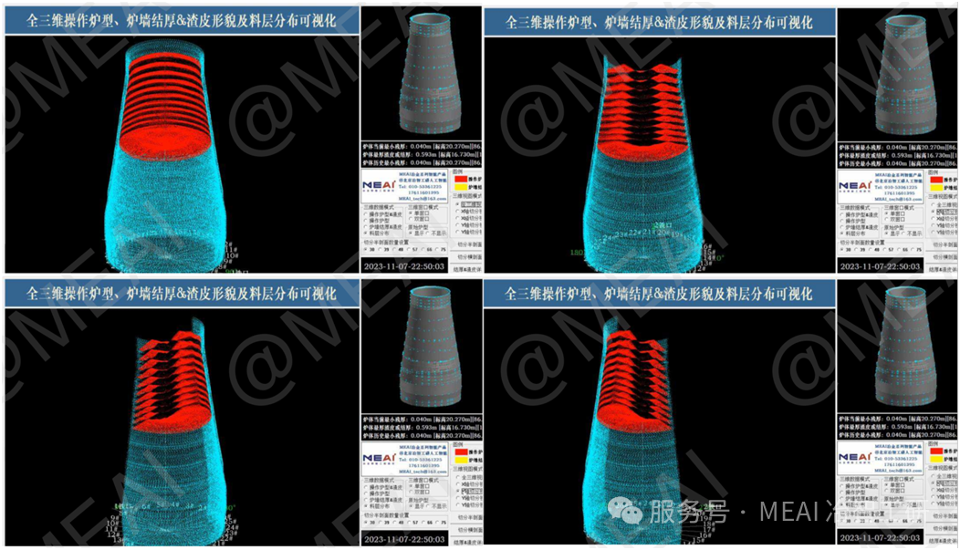 綜上,MEAI的全新一代高爐冶煉過程全三維可視化在線智能診斷分析係統,以技術領先性、精細化精度和智能化程度為冶金企業帶來了全新的技術價值和顯著的經濟效益,推動行業步入真正意義上的高爐“CT時代”。