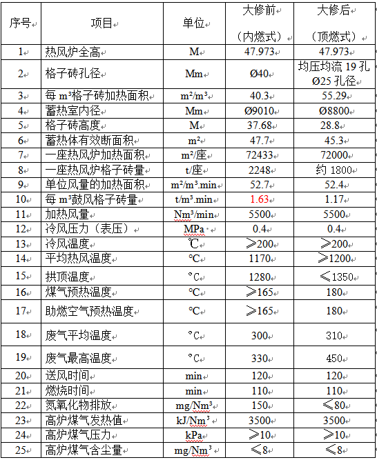 朝陽鋼鐵3#熱風爐大修前後性能參數對比表