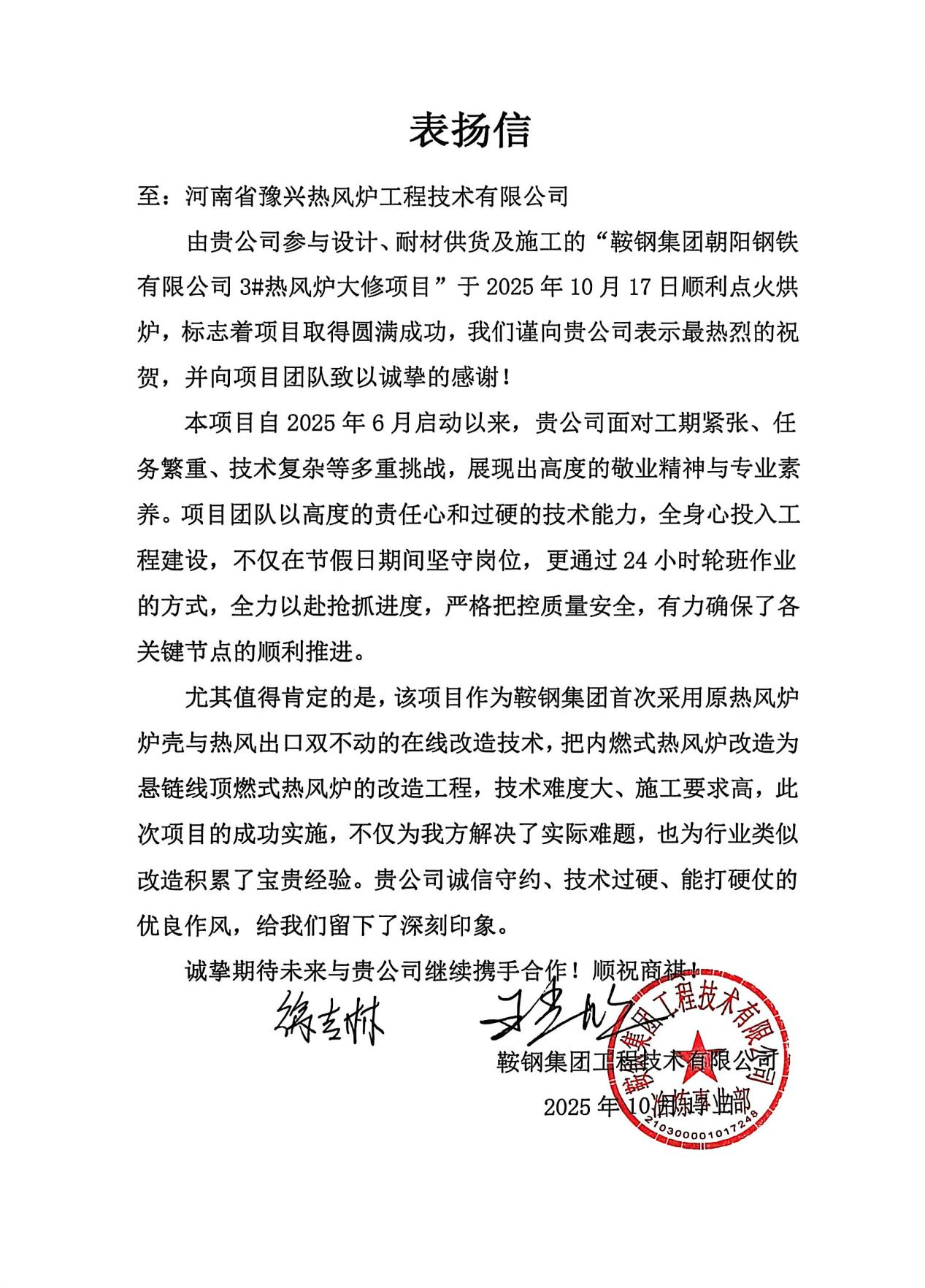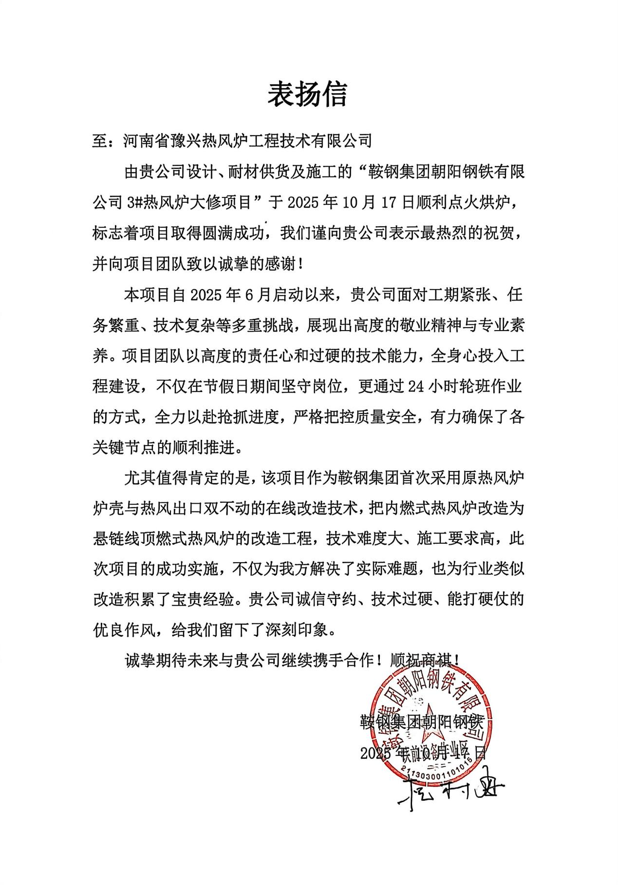 本次的優化改造的熱風爐技術特點和質量、工期,得到了鞍鋼集團朝陽鋼鐵廠的高度認可和讚譽,並給予豫興公司“工程盡職盡責、技術精益求精”的錦旗、並在表揚信函中給予“貴公司誠信守約、技術過硬、能打硬仗的優良作風”的極大鼓勵,這將激勵鞍鋼工程和豫興工程更加緊密合作,為今後行業技術改造工程奠定臻實基礎。