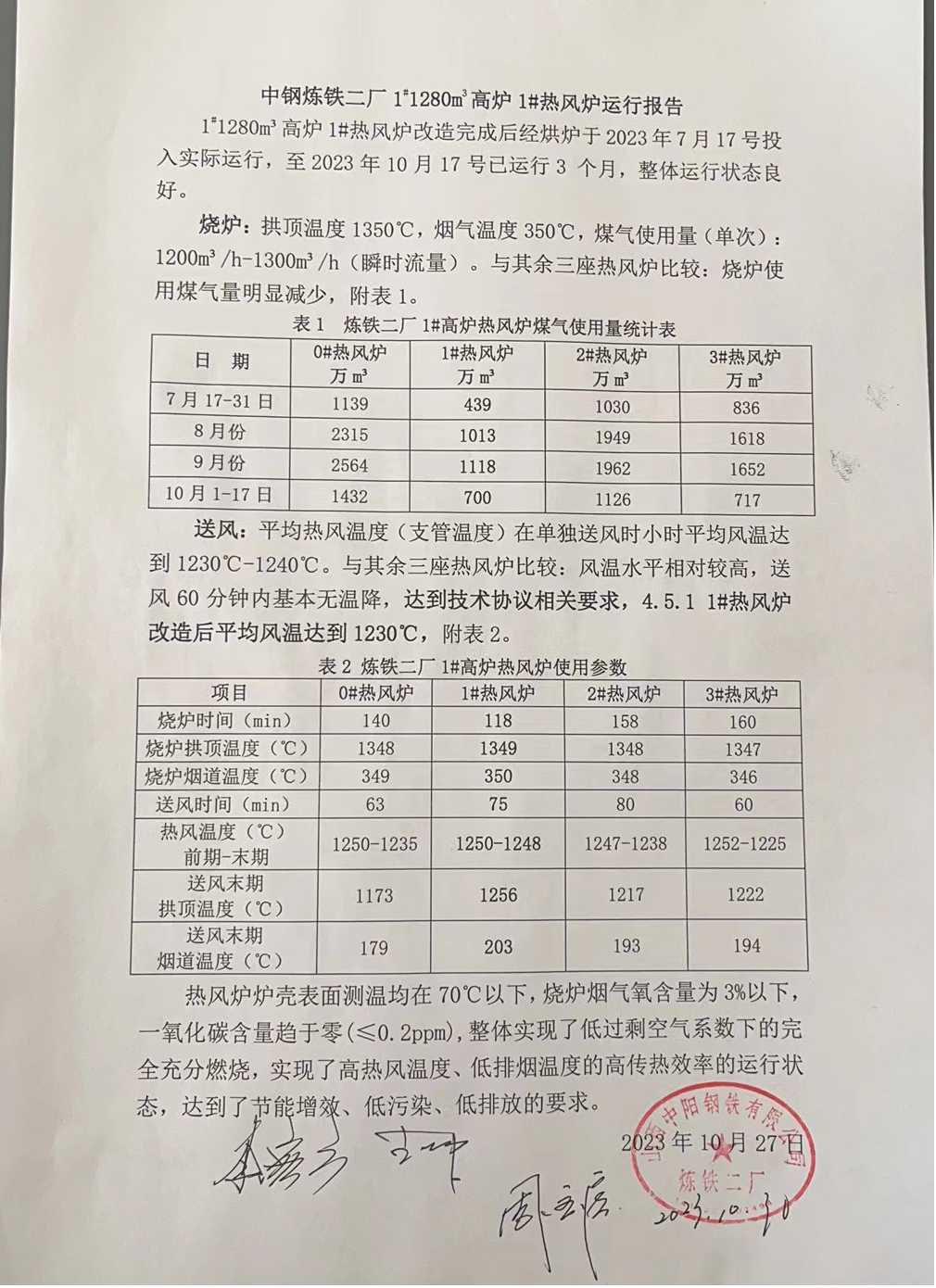 這些優化改造項目都是在2017年~2024年之間,在全國各地的煉鐵廠高爐熱風爐上完成的。例如,山西建龍1380m³、山西中陽1200m³、南鋼2000m³、廣東韶鋼3200m³、鞍鋼朝陽2650m³等(deng)多(duo)座(zuo)高(gao)爐(lu),均(jun)是(shi)采(cai)用(yong)內(nei)燃(ran)式(shi)熱(re)風(feng)爐(lu)爐(lu)殼(ke)利(li)舊(jiu)的(de)懸(xuan)鏈(lian)線(xian)頂(ding)燃(ran)式(shi)改(gai)造(zao)。其(qi)燃(ran)燒(shao)器(qi)改(gai)造(zao)方(fang)法(fa)也(ye)不(bu)盡(jin)相(xiang)同(tong),風(feng)溫(wen)和(he)排(pai)放(fang)也(ye)存(cun)在(zai)差(cha)異(yi)。但(dan)其(qi)改(gai)造(zao)效(xiao)果(guo)有(you)口(kou)皆(jie)碑(bei):南鋼截屏CO排放值,第三方現場儀表測試幾乎為零;山西中陽改造工程出具的使用報告CO小於0.2PPM;甘肅蘭州皋蘭1080m³、河北秦皇島宏興1080m³、河北華西2000m³等多座高爐熱風爐煙氣中測試的排放指標也小於20~300PPM。