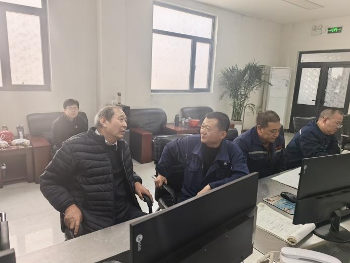 圖為2025年10月29日中國金屬學會專家委員會主任王天義在金鼎重工熱風爐操作室向金鼎重工煉鐵廠廠長江海峰了解熱風爐運行情況