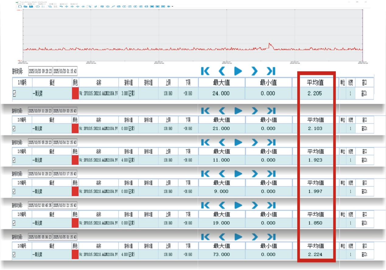 圖為金鼎重工2025年10月5日-20日期間部分在線監測的CO排放數據,根據數值顯示CO平均排放值為2.04mg/m³