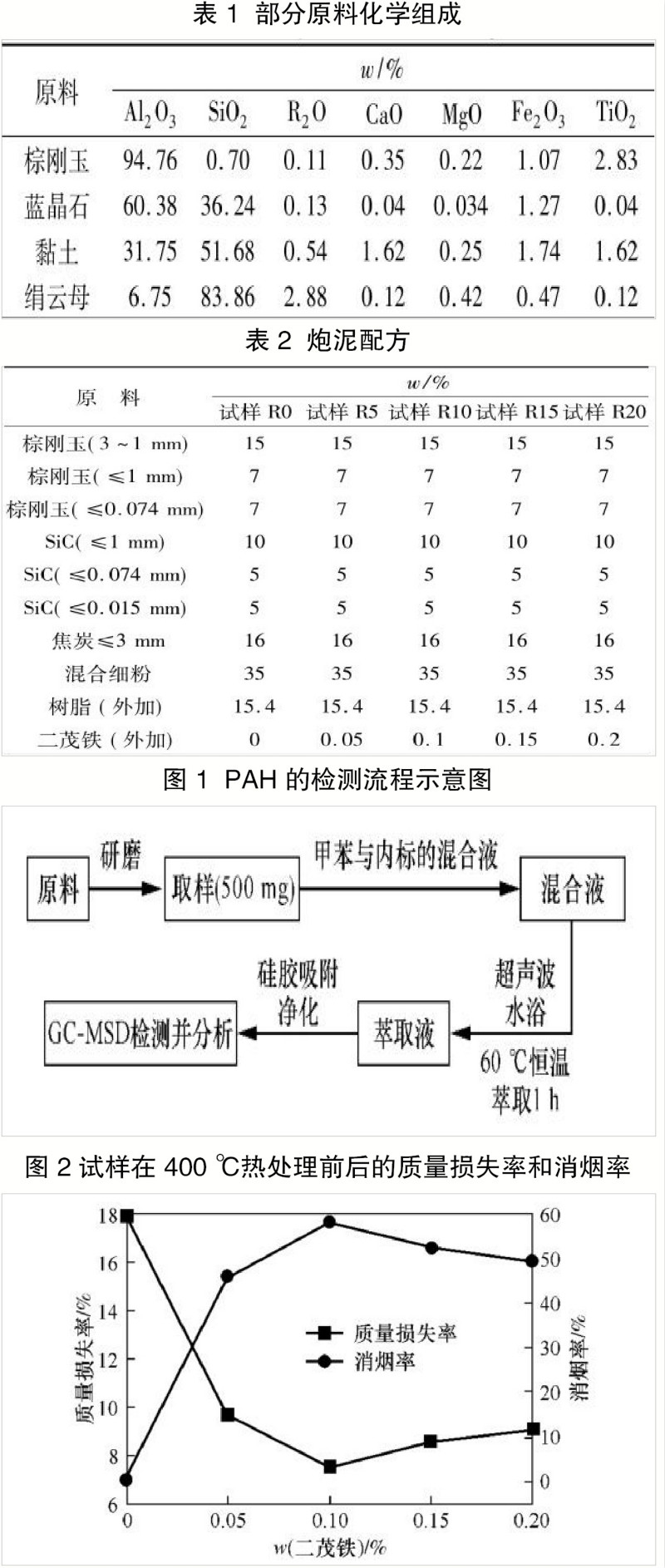 對試驗使用的環保瀝青、環保樹脂及試樣R10 進行PAH 檢測的結果顯示,環保樹脂中不含有PAHs; 環保瀝青中雖然含有41× 10-6(w) 的BaP,但是其在炮泥中隻是少量加入,因此,BaP 的含量還會進一步降低; 試樣R10 中BaP 的含量僅為4.3 × 10-6(w) ;而二茂鐵並不含有BaP。因此,根據歐洲標準關於炮泥BaP 含量低於50 × 10-6(w)的要求,本試驗所製備的炮泥是一種環保型炮泥。