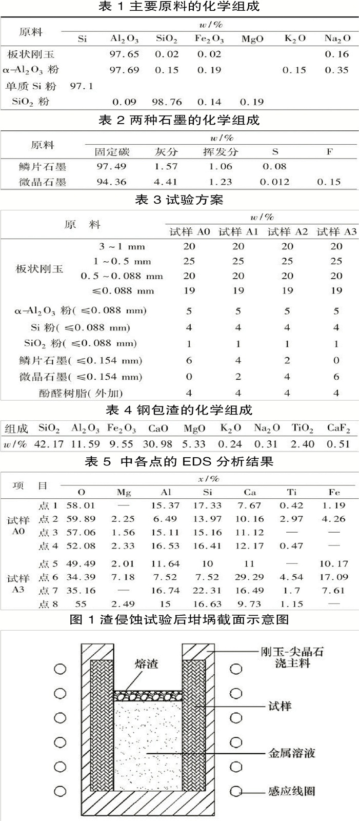 試驗所用主要原料:板狀剛玉( 3 ~ 1、1 ~ 0.5、0.5 ~ 0.088、≤0.088 mm) ,Si 粉( ≤0.088 mm) ,鱗片石墨( ≤0.154 mm) ,郴州微晶石墨( ≤0.154 mm) ,α-Al2O3粉( ≤0.088 mm) ,SiO2粉( ≤0.088 mm) 。原料化學組成見表1,兩種石墨的化學組成見表2。