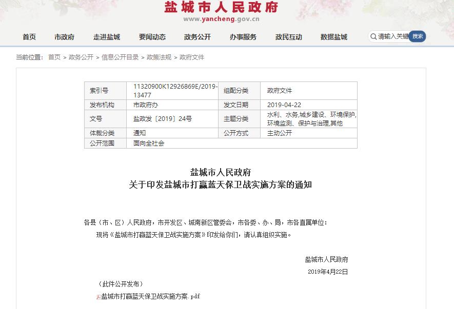關於印發鹽城市打贏藍天保衛戰實施方案