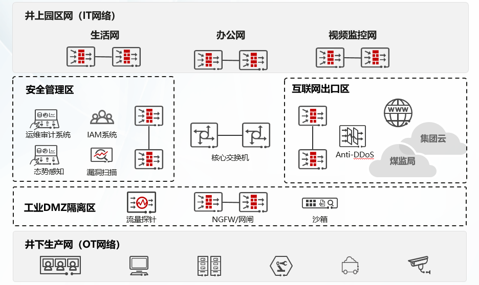 為了實現升級轉型,龐龐塔煤礦圍繞打造“國內一流、行業示範”的智能領航型標杆礦井為總目標,不斷加快數字化、網絡化、智能化“三化牽引”,通過從“人控”到“數控”不斷升級,從“自動”到“智能”全麵提速,網絡安全從“被動”到“主動”,建成了“一盤棋、一張網、一個平台、一個中心、一張圖”,實現了綜放工作麵、掘進工作麵、主輔運輸係統、無人值守係統、安全管控係統的智能化建設,同步規劃了智能礦山安全解決方案,麵向生產痛點需求,構建“合規”“安全”“可信”的非侵入式安全體係,始於等保,高於合規,多級縱深,主動防禦,保證生產不中斷,構建起了設備、網絡、流量、全棧可信的一張網。